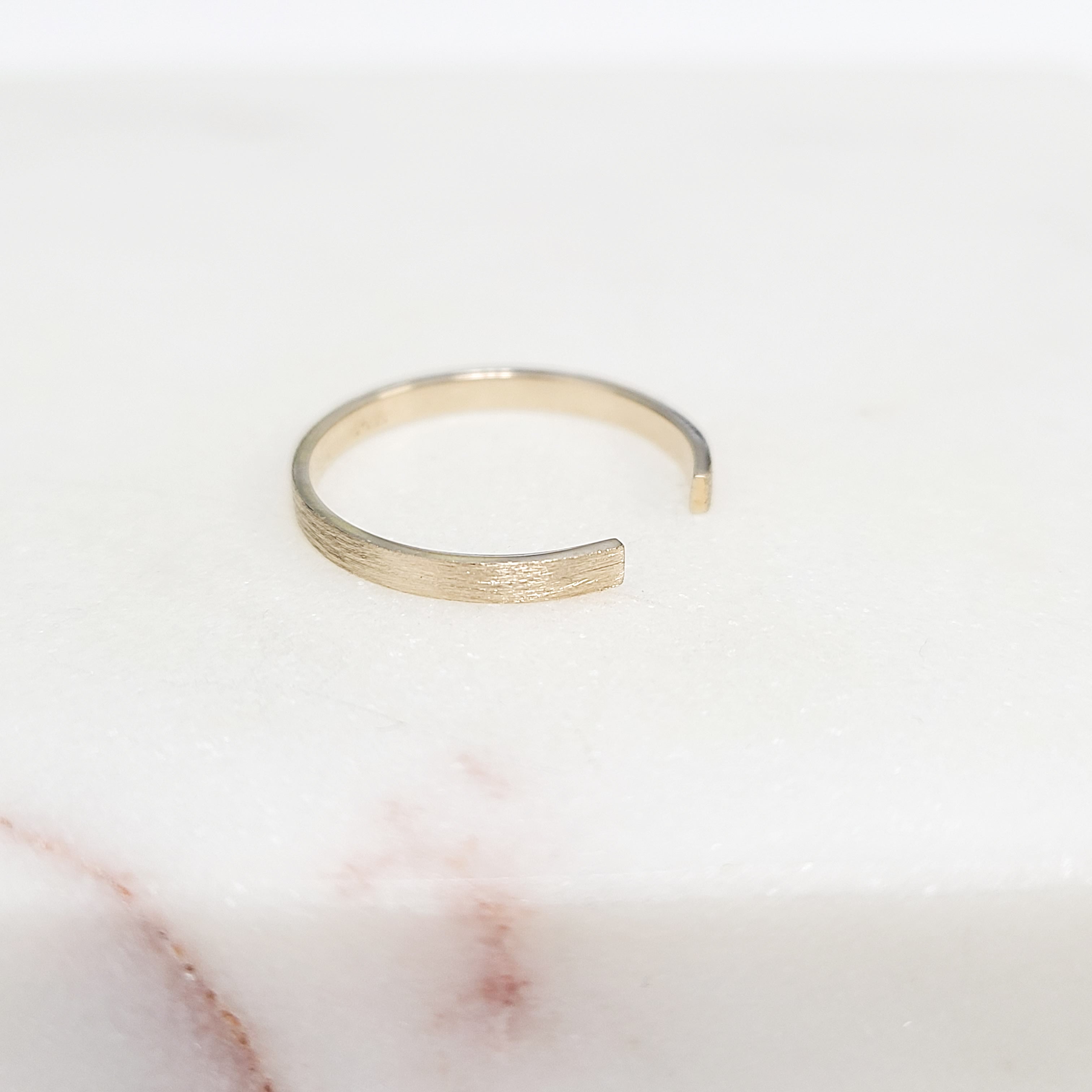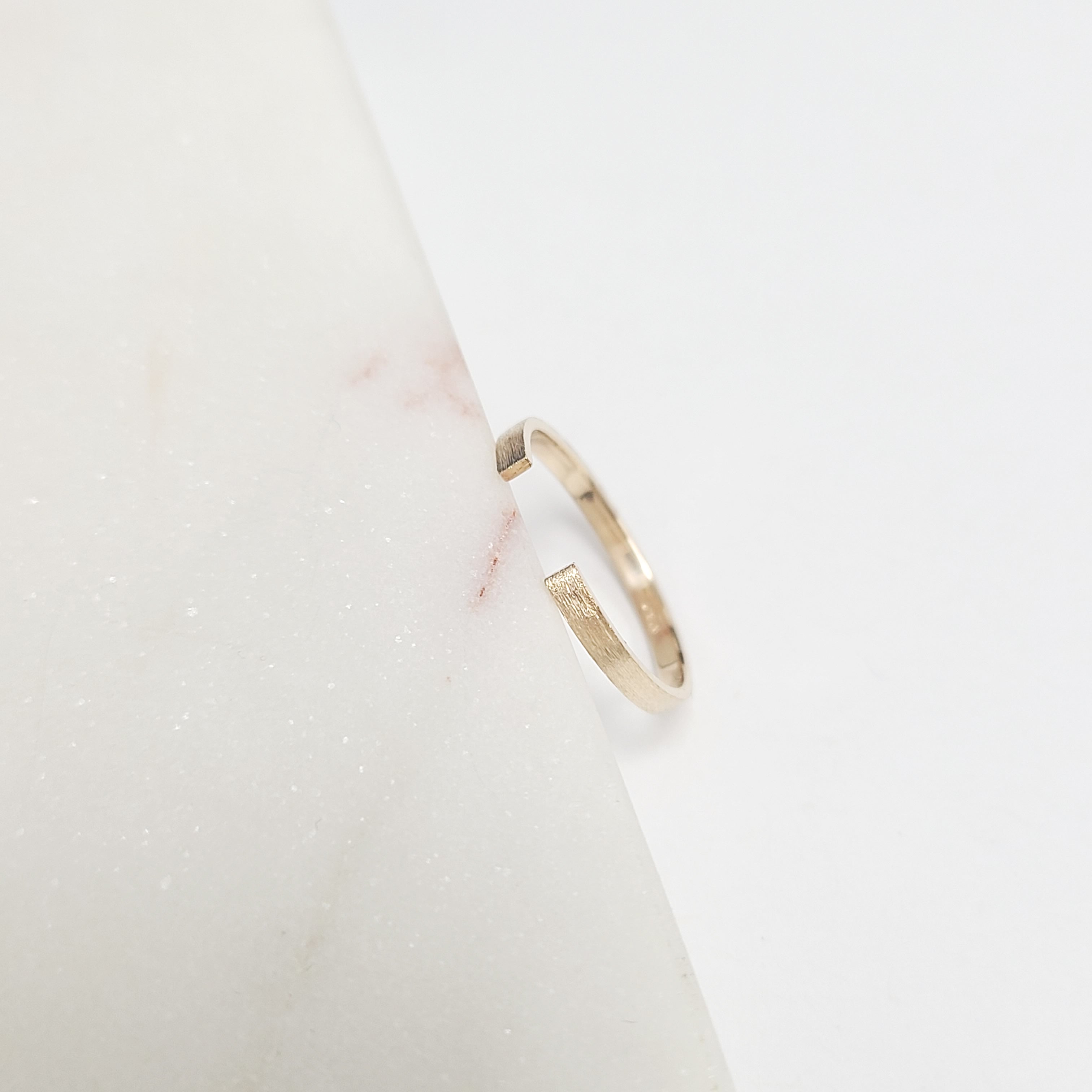 A sleek spacer band designed to sit perfectly between your engagement ring and wedding band. Crafted with a comfort fit and a matte finish, this ring fills the gap seamlessly and rests flush alongside your rings for a flawless, stacked look.