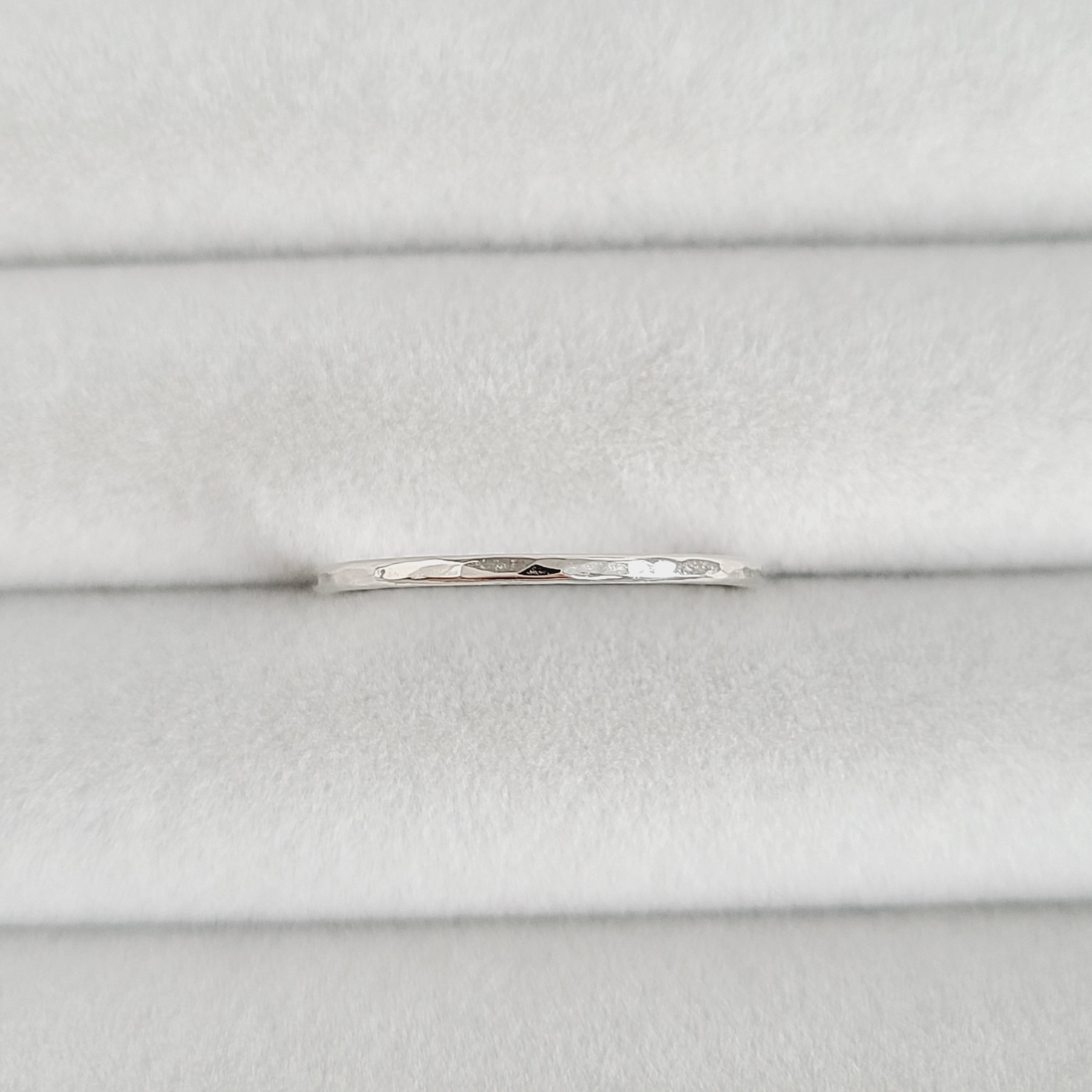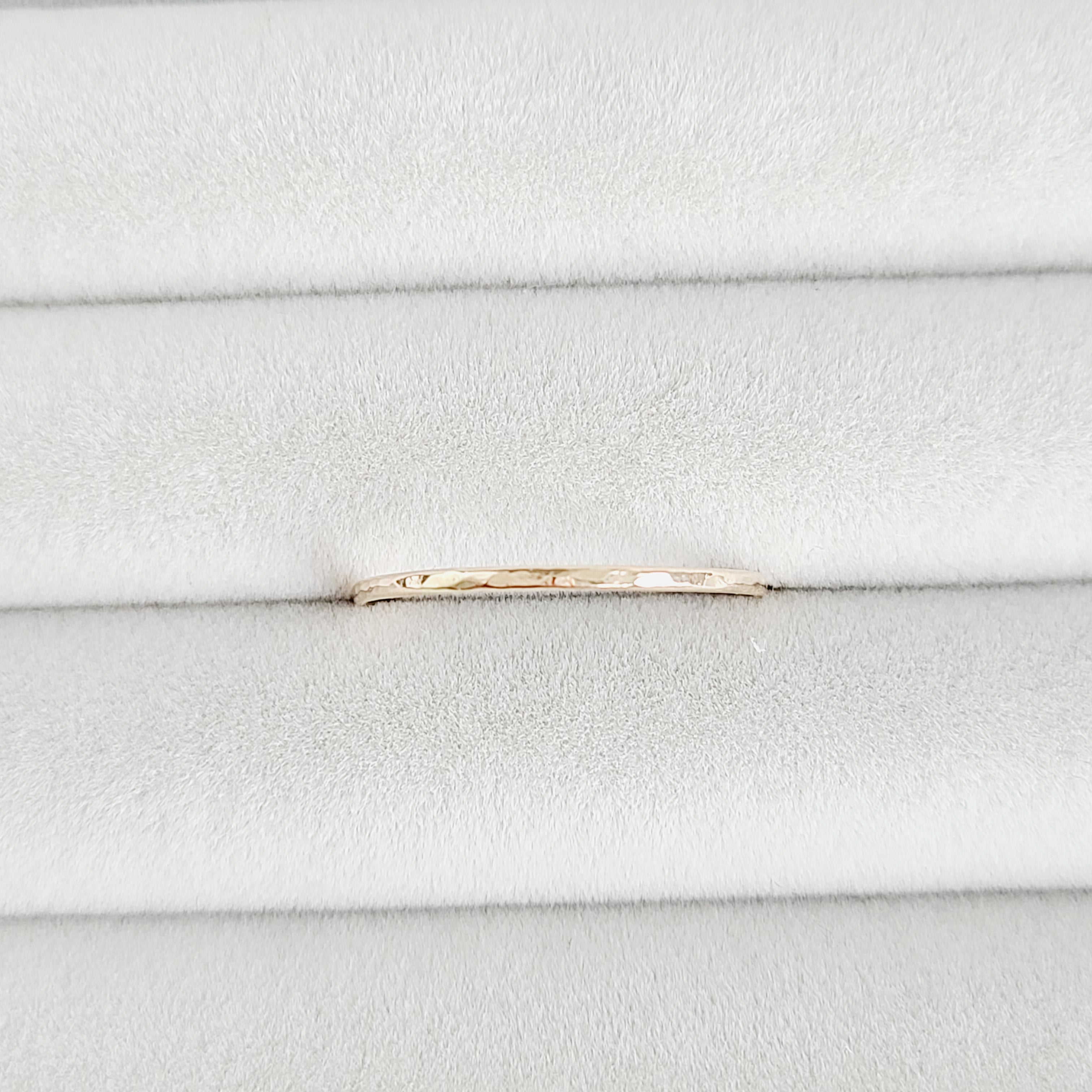 Hammered by hand and made from solid gold. This Thin Stacking Ring features a unique hammer finish on each ring for a design that never goes out of style. Dainty yet strong, this gold ring is versatile and will be a gorgeous addition to for any style.