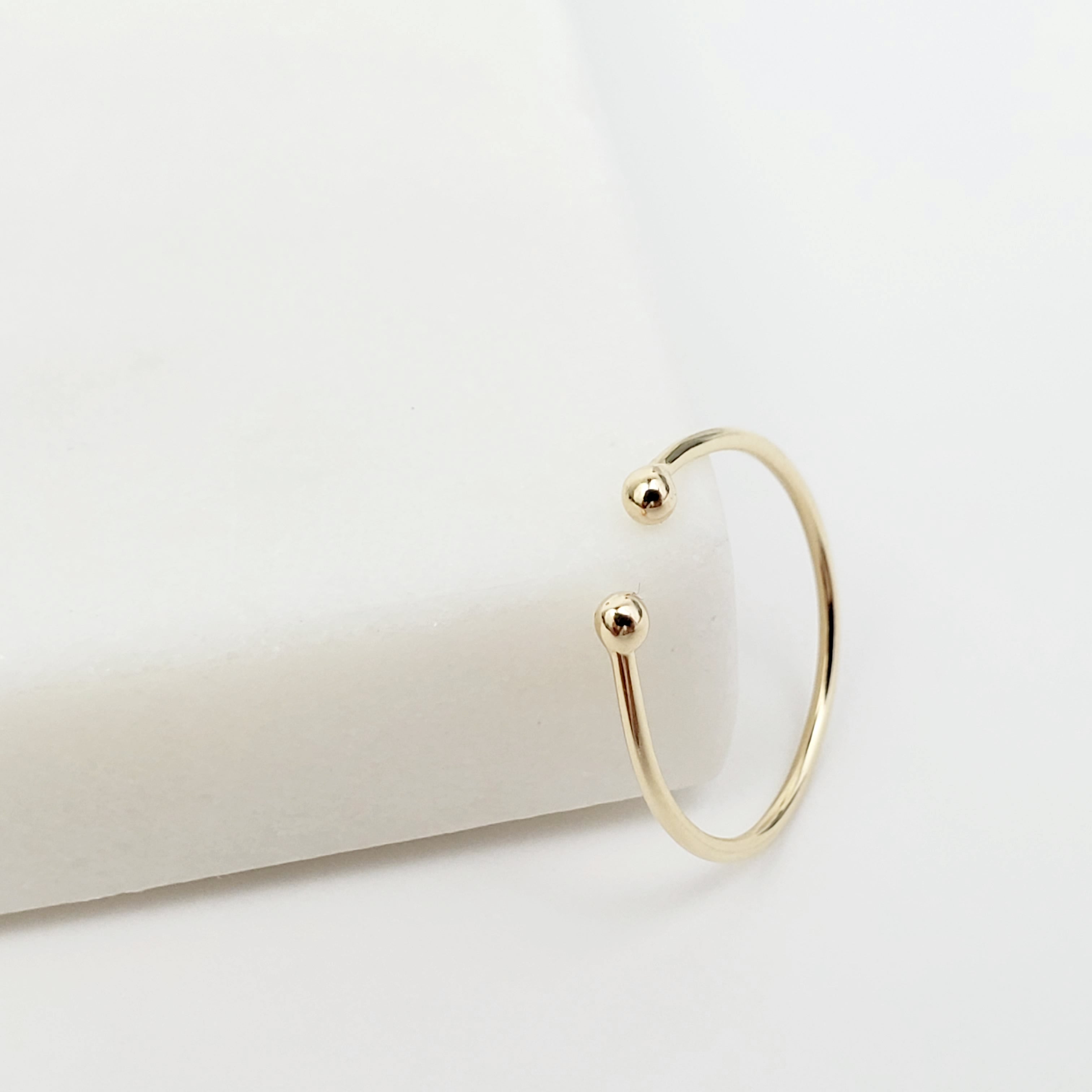 Hand crafted from solid gold, these open stacking rings are a beautiful addition to any collection. Every ring is unique and each ball end is shaped down by hand from 18 gauge gold wire. The open ended design also allows for a flexible & perfect fit for everyone.
